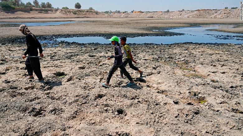 Người dân đi trên sông Diyala cạn nước ở Iraq ngày 29/6. Ảnh: CNN