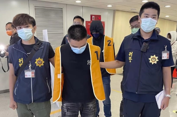 Cảnh sát Đài Loan áp giải hai nghi phạm bị trục xuất khỏi Bangkok, Thái Lan và được cho là có liên quan đến các vụ lừa đảo ở Campuchia. (Ảnh: Cục Điều tra Hình sự Đài Loan/AP)