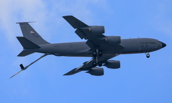 Chiếc KC-135T hạ cánh với cần tiếp dầu ở trạng thái triển khai hôm 10/9. Ảnh: Twitter/eos40is.