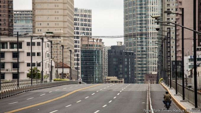 Một con đường vắng lặng v́ phong tỏa ở Thượng Hải ngày 25/4. Ảnh: NYT