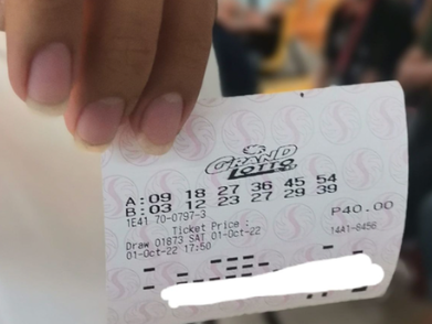 Trong kỳ quay ngày 1/10 của giải Grand Lotto ở Philippines. 400 người đến chia nhau giải nhất với tổng giải thưởng 236 triệu peso. Các số may mắn gồm: 9, 18, 27, 36, 45 và 54.