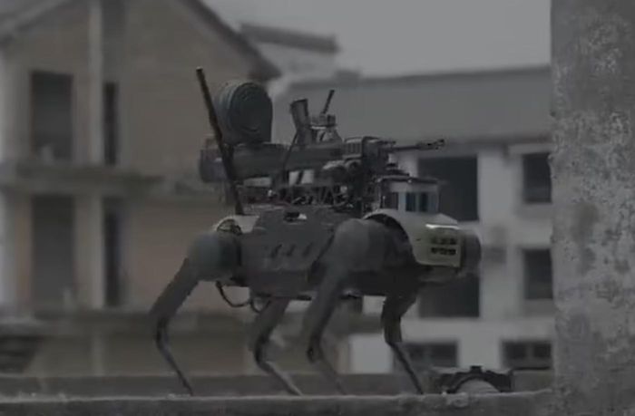 Một nhà thầu quân sự Trung Quốc vừa tung một video clip thể hiện công nghệ quân sự mới đáng sợ của họ, với hình ảnh một robot chó (robodog) đổ bộ từ máy bay không người lái, được trang bị súng máy tấn công.