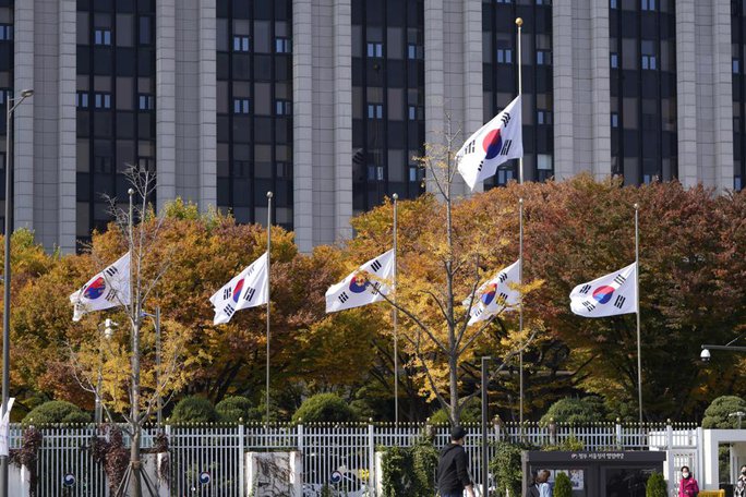 Những lá cờ rủ tại khu phức hợp các cơ quan chính phủ của Hàn Quốc ở Seoul - Ảnh: AP