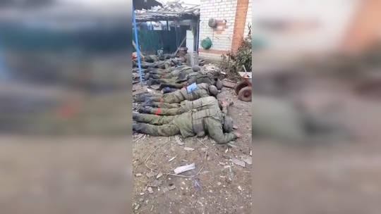 Một đoạn video cho thấy. Một nhóm binh sĩ mặc đồng phục Nga đầu hàng những người lính mặc đồng phục có phù hiệu Ukraine. Nhóm quân nhân Nga – nằm dưới đất – có thể là đã tử vong.