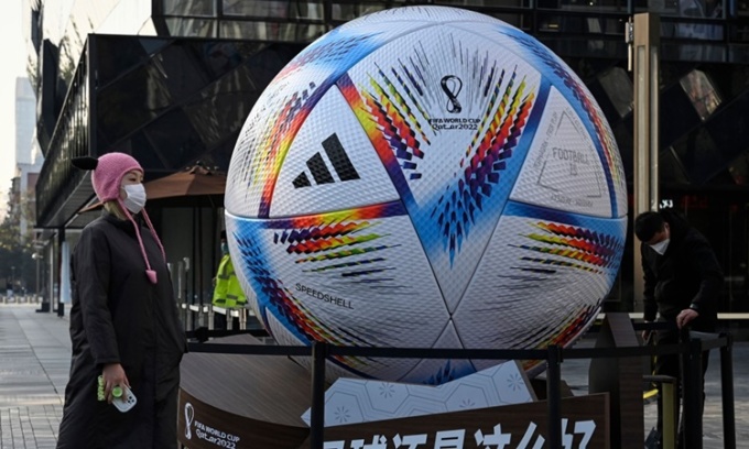 Mô hình quả bóng World Cup 2022 cỡ lớn được trưng bày tại một trung tâm thương mại ở thủ đô Bắc Kinh, Trung Quốc, hôm 17/11. Ảnh: AFP.