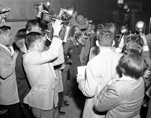 Báo giới tập trung quanh lối vào phòng xử án ở Cleveland khi Samuel được dẫn giải đến phiên xét xử, năm 1954. Ảnh: Mtsu