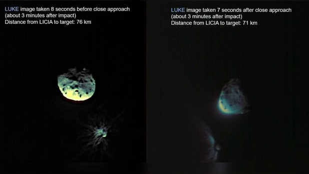 Những hình ảnh do các kính viễn vọng trên mặt đất và không gian chụp trước và sau vụ va chạm đang giúp các nhà khoa học ghép lại những gì đã xảy ra khi tàu vũ trụ đâm vào Dimorphos với tốc độ khoảng 22.530 km/giờ.