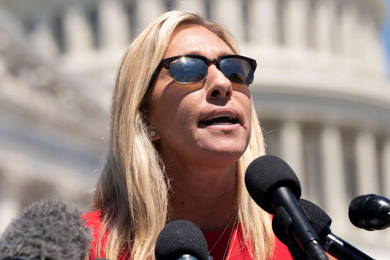 © Jacquelyn Martin/AP Rep. Marjorie Taylor Greene (R-Ga.) speaks at a news conference on Thursday, June 17, 2021.