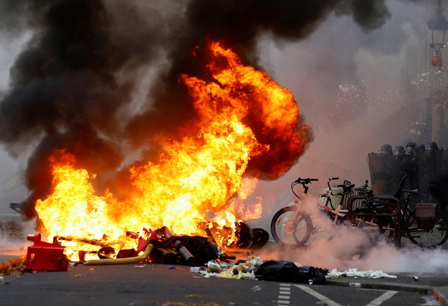 Khói bốc lên từ đám cháy trong cuộc biểu tình ở Paris hôm 24/12. Ảnh: Reuters.