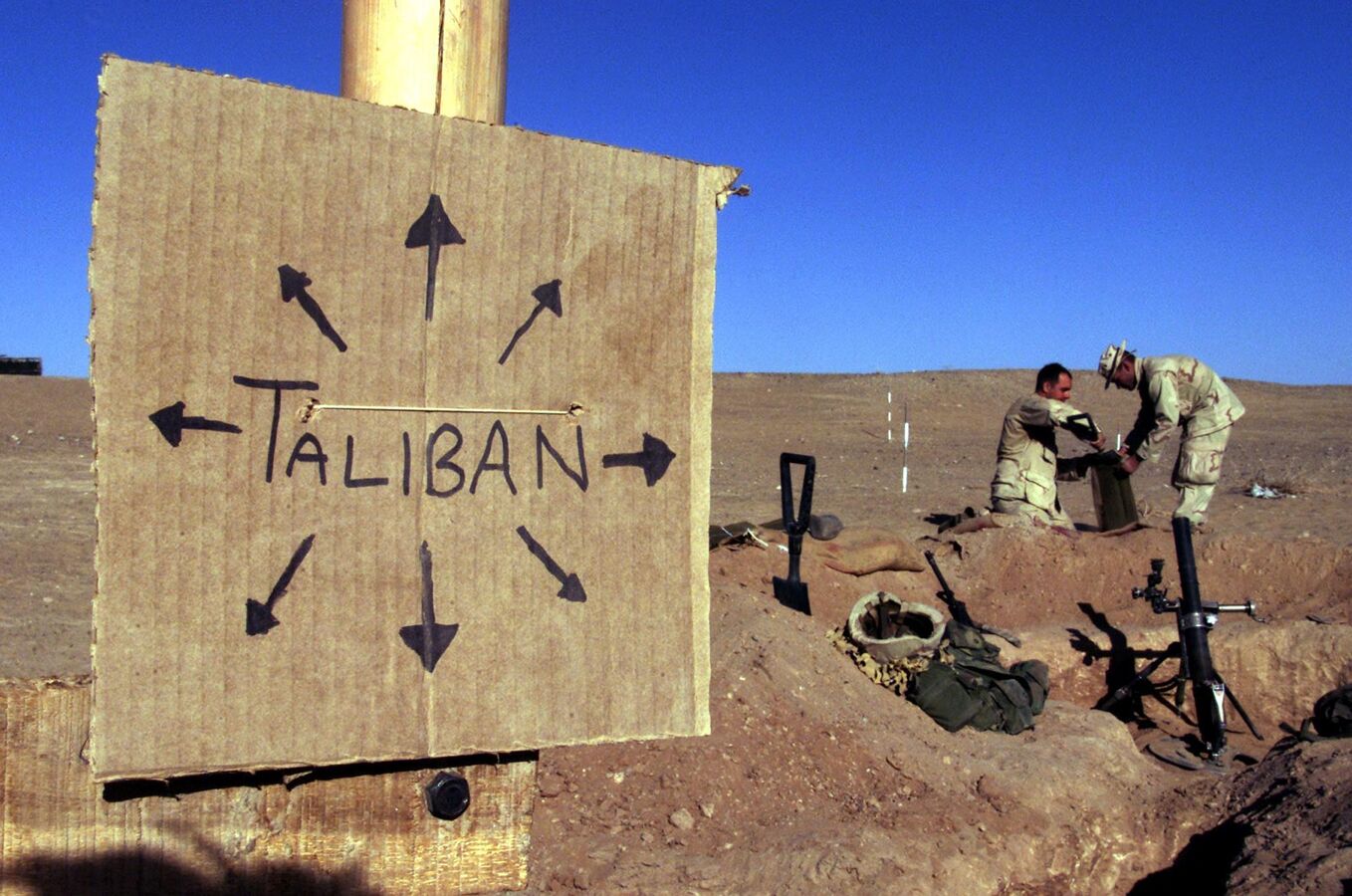 Binh sĩ lấp các bao cát xung quanh vị trí súng cối hạng nhẹ trên tiền tuyến của Căn cứ Thủy quân lục chiến Mỹ ở miền nam Afghanistan tháng 11/2001. Ảnh: Reuters