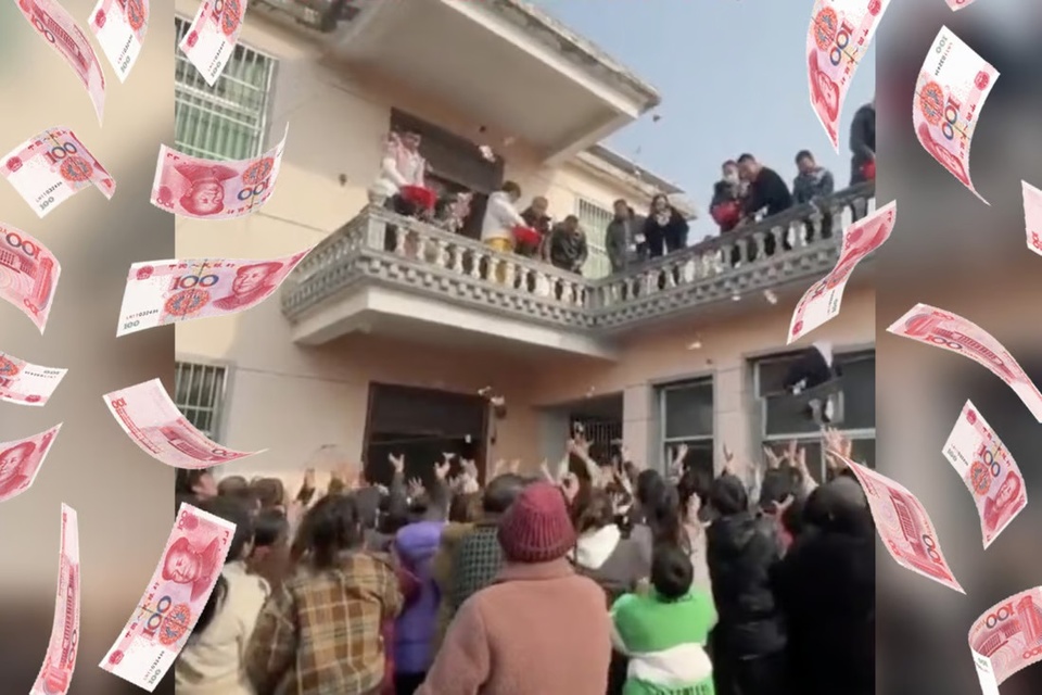 Gia đình ném tiền cho khách trong tiệc sinh nhật đã gây nên cảnh tượng hỗn loạn. Ảnh: SCMP.