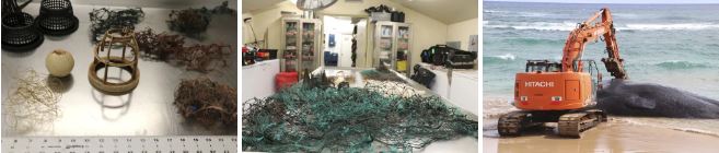 Dạ dày của con cá voi chứa sáu bẫy cá hagfish, bảy loại lưới đánh cá, hai loại túi nhựa, đèn bảo vệ, dây câu và phao từ lưới. Các nhà khoa học cũng tìm thấy xương của những loài khác trong dạ dày cá voi.