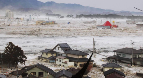 Thành phố Rikuzentakata thuộc tỉnh Iwate bị nhấn chìm trong nước ngày 11/3/2011. Ảnh: Kyodo