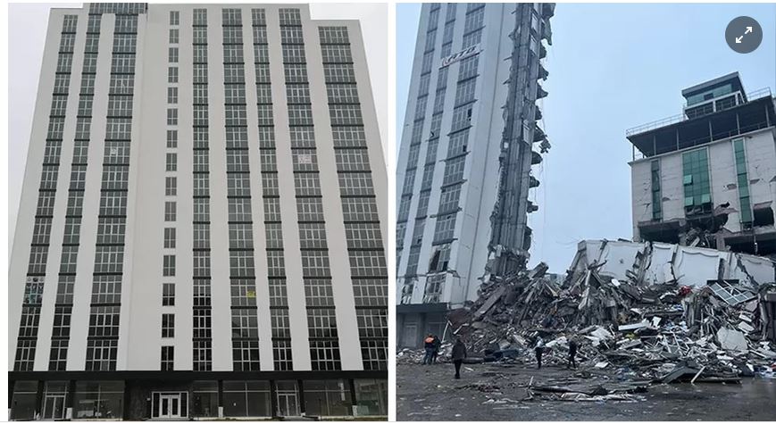 Tòa nhà ở Iskenderun vào năm 2019 (trái) và sau trận động đất ngày 6/2. Ảnh: BBC.