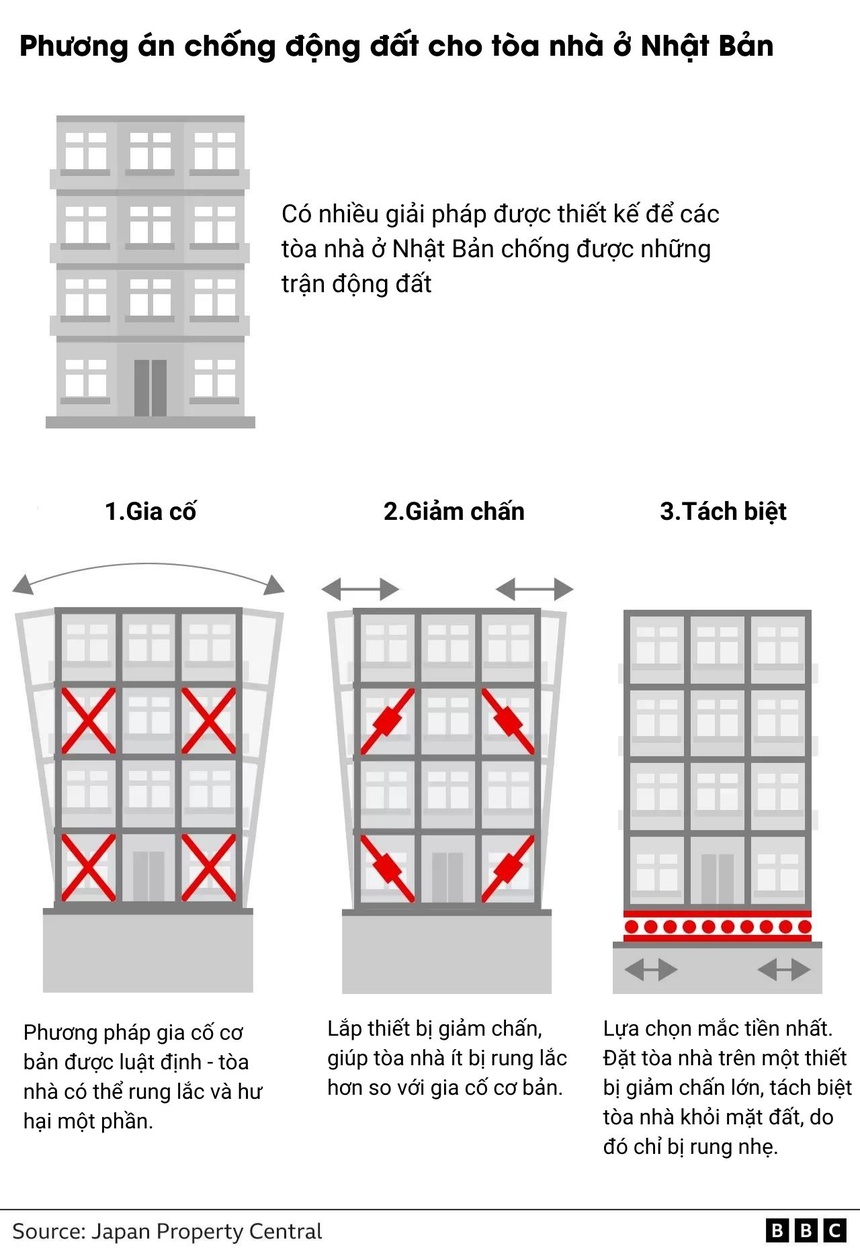 Các giải pháp gia cố nhà tại Nhật Bản để chống chọi động đất. Đồ họa: BBC.
