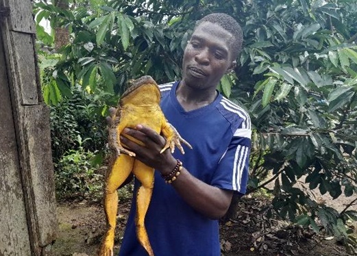 Cedrick Fogwan cầm trên tay một trong những con ếch Goliath phá kỷ lục thế giới. Ảnh: BBC.