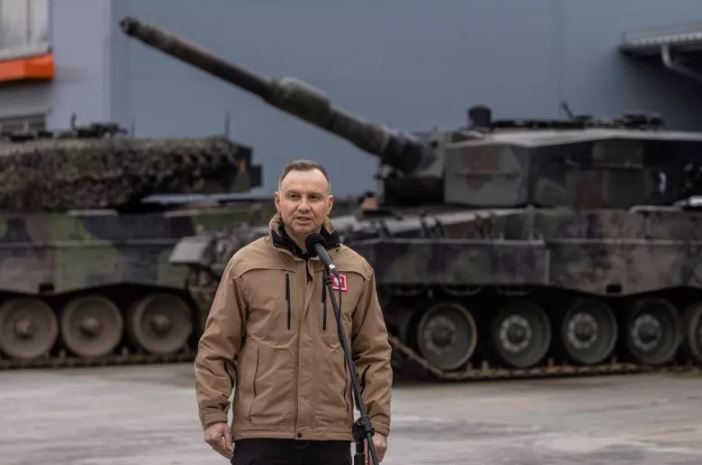 Tổng thống Ba Lan Andrzej Duda trong cuộc gặp với các giảng viên huấn luyện binh sĩ Ukraine sử dụng xe tăng Leopard 2 A4, tại căn cứ quân sự ở Swietoszow, Ba Lan vào ngày 13/2/2023. Ảnh: Getty
