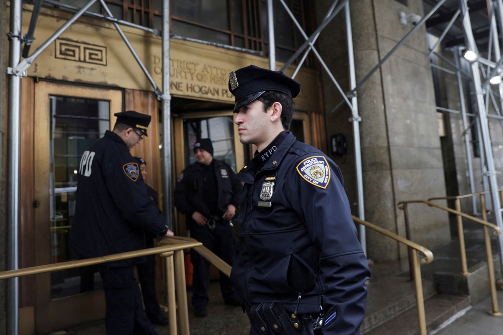 Cảnh sát New York tuần tra gần tòa án hình sự New York, phía trước văn phòng của công tố viên quận Manhattan Alvin Bragg, để đề phòng bạo lực trước thông tin ông Trump bị truy tố, ngày 1/4. Ảnh: Reuters.