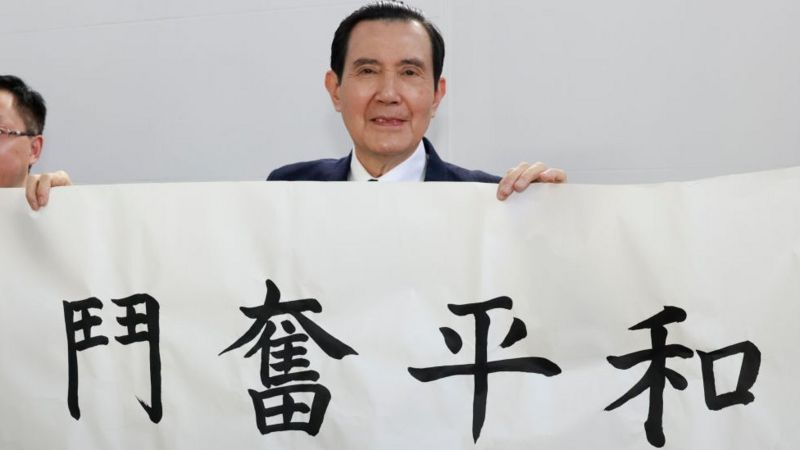 Ông Mã Anh Cửu với dòng chữ 'Phấn đấu vì Hòa bình' nhưng chuyến thăm của ông bị chê là "ngây thơ" chỉ làm lợi cho Bắc Kinh