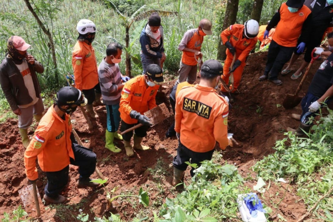 Cảnh sát điều tra mảnh đất nơi tìm thấy 12 thi thể, gần nhà của một thầy cúng. Ảnh: Cảnh sát Trung Java