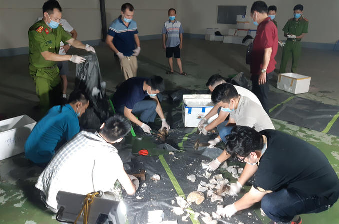 Cảnh sát kiểm đếm ma tuý giấu trong dạ dày lợn. Ảnh: Công an cung cấp