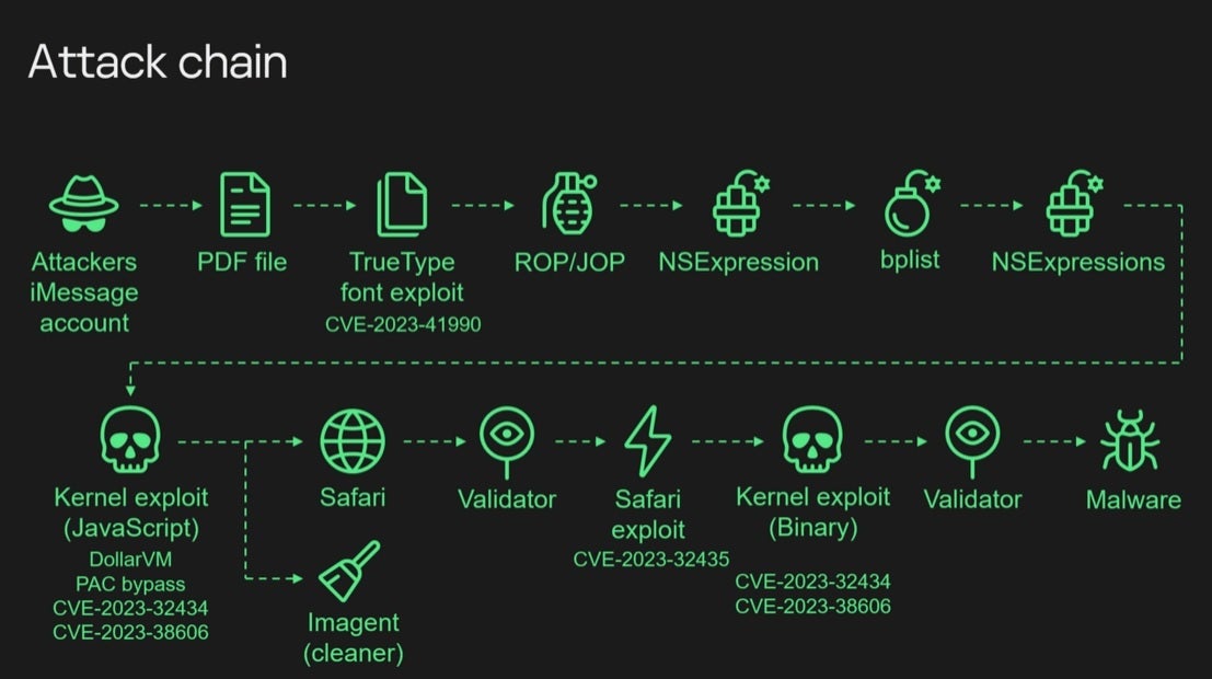 Phần mềm độc hại và chiến dịch dẫn đến việc cài đặt nó đều được gọi là "Tam giác" và nó chứa bốn lỗ hổng zero-day, điều đó có nghĩa là những kẻ tấn công đã biết về những lỗ hổng này trước khi Apple phát hiện ra. Kể từ đó, Apple đã vá các lỗ hổng như sau: