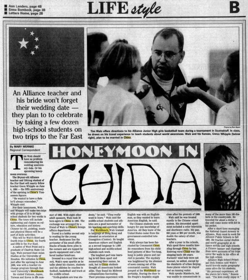 Walz từng dạy học ở Trung cộng và qua lại nước cộng sản này hơn 30 lần. Và khi những người yêu tự do tưởng niệm vụ thảm sát Lục Tứ thì vợ chồng Tim Walz - Gwen Walz cắt bánh, mở champagne mừng ngày cưới.