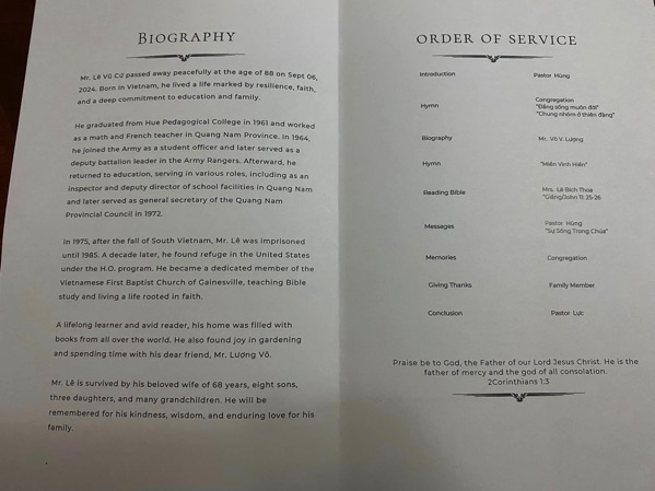 Gần 30 năm trên vùng đất Gainesville, GA, ba mẹ đã tham gia hội thánh baptist phục hưng Gainesville, Georgia cho đến ngày Chúa gọi về. Trong suốt 90 năm cuộc đời, ông là người giản dị, ứng xử bà con mực thước. Đặc biệt chữ viết rất đẹp, trang trí trình bày trong các nghi lễ, các hội nghị biết chơi đàn hát nhạc. Những tài này đã giúp ông phục vụ hữu ích cho cộng đồng, bà con ở những nơi mà ông sinh