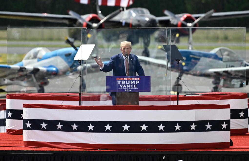 Ông Trump phát biểu sau tấm kính chống đạn tại thành phố Asheboro, bang Bắc Carolina ngày 21/8. Ảnh: AFP