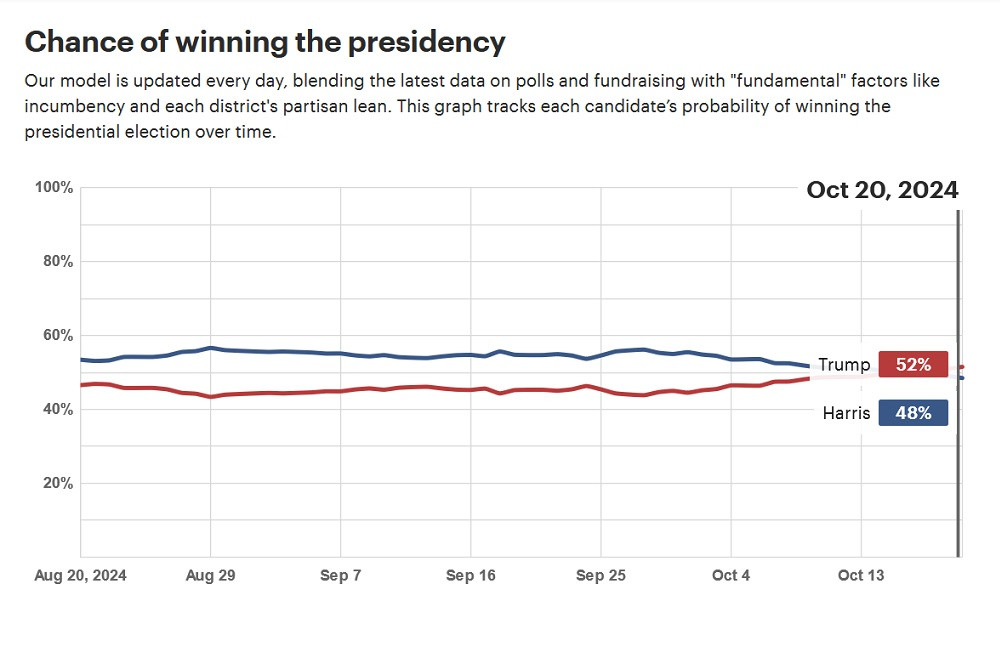 Tuy nhiên kể từ ngày 16/10 tới nay, cơ hội chiến thắng của ông Trump dần ngang bằng, và tới ngày 20/10 thì lần đầu vượt đối thủ Harris.