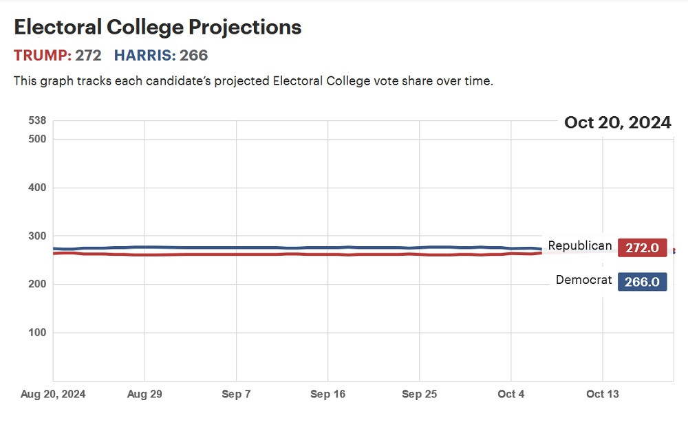 Tỷ lệ dự đoán về phiếu Đại cử tri của hai ứng viên Trump và Harris hôm 20/10. Ảnh: The Hill