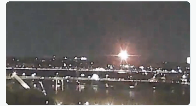 Camera thu hình từ tòa nhà Kennedy Center bắt được đốm sáng lúc máy bay có thể đã nổ trên không trung trước khi rơi xuống dòng sông Potomac đêm 29 tháng Giêng, 2025, tại Washington, D.C. (Ảnh: Kennedy Center Webcam/@aletweetsnews/X)