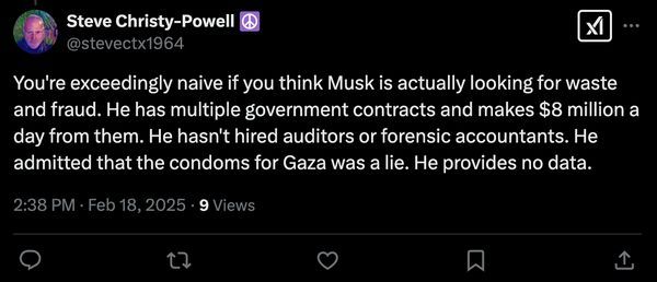 Do you know how much money a day Mr. Musk will receive from the federal government? The answer is $8 million a day. Just last year he was promised $3 billion from close to 100 contracts with the federal government.