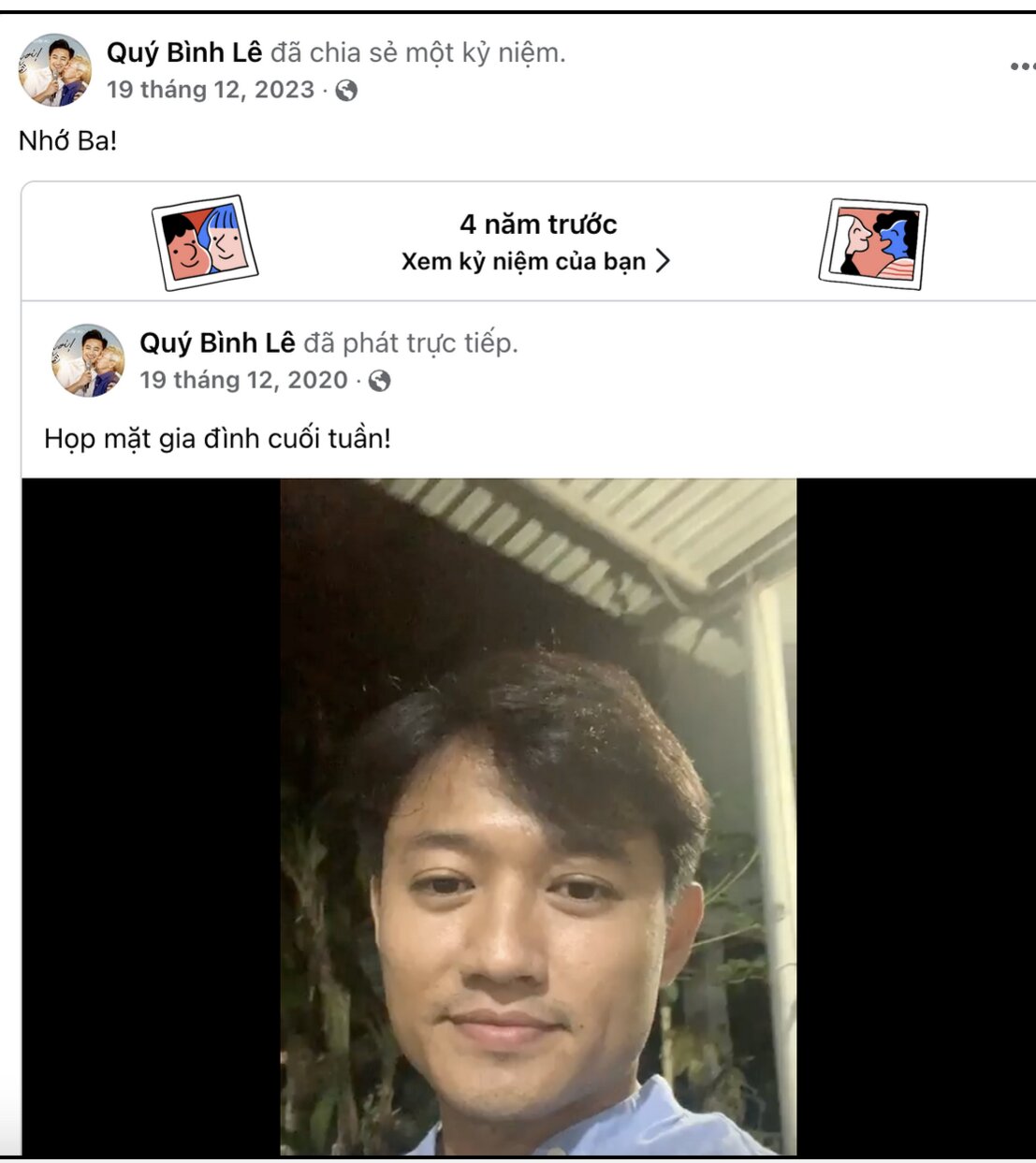 Trên trang cá nhân, Quý Bình từng chia sẻ một bài viết đầy cảm xúc vào ngày 19/12/2023 với dòng trạng thái ngắn gọn: "Nhớ ba!". Đây là bài đăng được anh chia sẻ lại từ kỷ niệm cũ vào năm 2020, khi anh livestream trong buổi họp mặt gia đình. Gương mặt rạng rỡ của nam diễn viên trong bức ảnh khi ấy càng khiến người hâm mộ nghẹn lòng khi nhớ về những tháng ngày anh vẫn khỏe mạnh, tràn đầy sức sống.