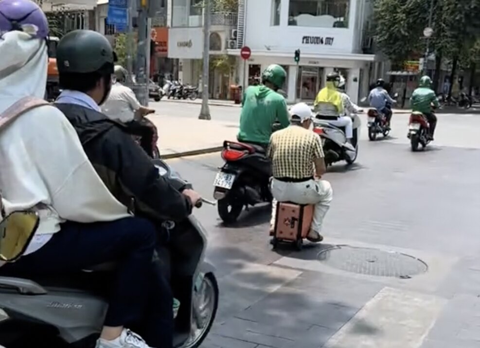 Clip ghi lại cảnh một người đàn ông cưỡi vali di chuyển giữa dòng xe cộ tấp nập tại trung tâm TPHCM.