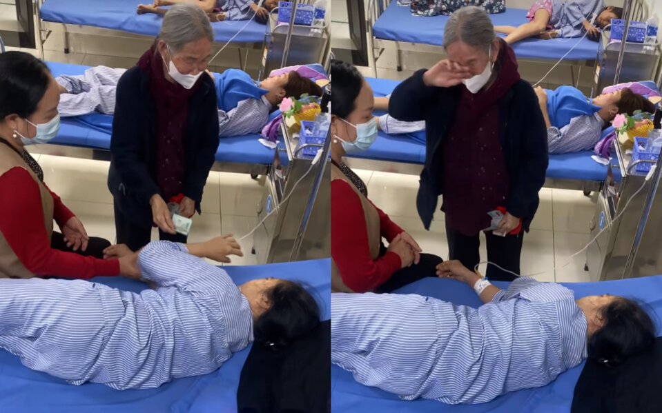 Hình ảnh cụ đứng bên giường bệnh, thân hình gầy nhỏ, đôi mắt đỏ hoe vì thương con, rồi lặng lẽ đưa cho con ít tiền khiến nhiều người chứng kiến không khỏi nghẹn ngào.