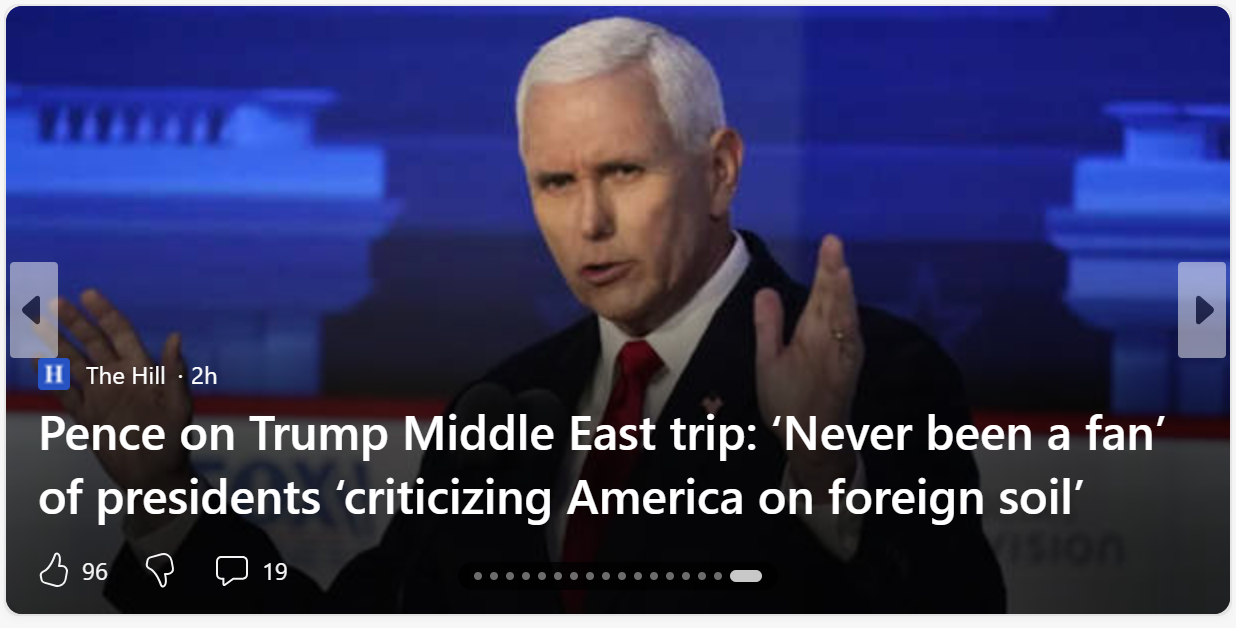 Cựu Phó Tổng thống Mike Pence đã chỉ trích nhẹ Tổng thống Trump trong một cuộc phỏng vấn được phát sóng trên chương trình "Meet the Press" của NBC vào Chủ Nhật về ít nhất một khía cạnh trong chuyến đi của ông tới Trung Đông tuần này, nói rằng ông "chưa bao giờ thích các tổng thống Mỹ chỉ trích nước Mỹ khi đang hiện diện trên đất nước khác".