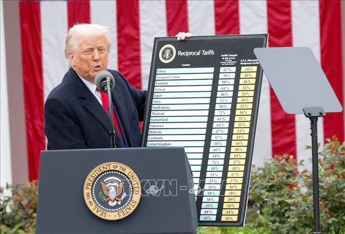 Tổng thống Mỹ Donald Trump công bố các mức thuế đối ứng mới tại Nhà Trắng ngày 2-4. Ảnh: Reuters/TTXVN