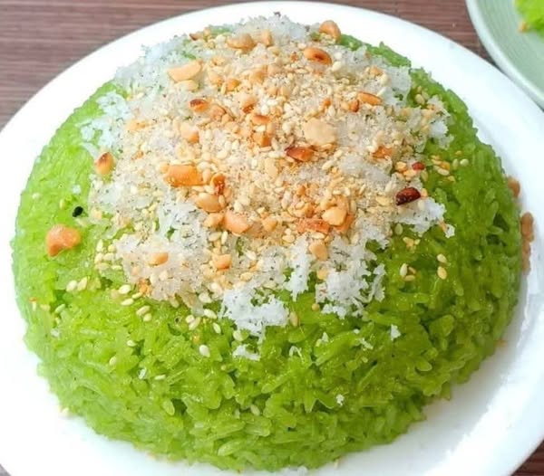 Bước 4: Trộn đường vào với hạt vừng, muối, để sang một bên. Cho xôi lá dứa ra đĩa, cho dừa nào lên trên, rắc hỗn hợp vừng lên rồi thưởng thức!