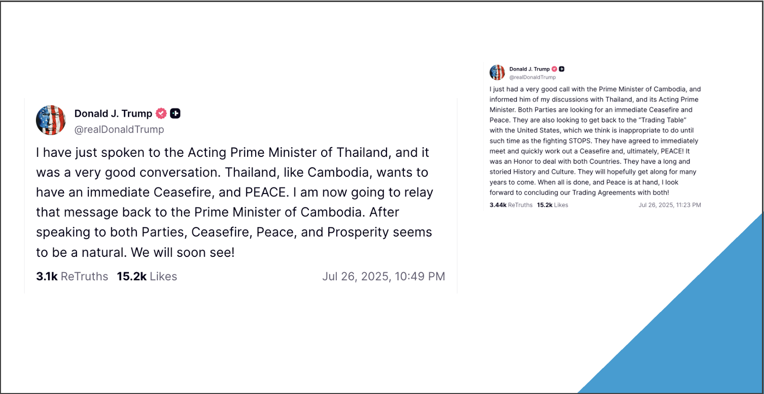 Thông báo của Tổng thống Mỹ Donald Trump trên mạng xã hội Truth Social về các cuộc điện đàm với quyền Thủ tướng Thái Lan, ông Phumtham Wechayachai và Thủ tướng Campuchia, ông Hun Manet.