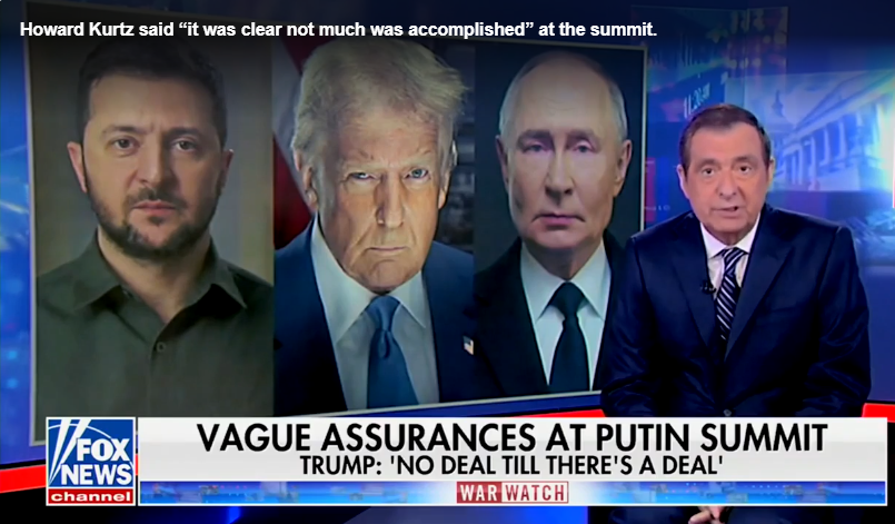 "Rõ ràng là [Trump] coi đây là một thành công, và [tin rằng] việc đưa tin đang không diễn ra suôn sẻ," Kurtz nói, trước khi lưu ý rằng Fox News đã xác nhận rằng "Trump đang ủng hộ kế hoạch của Putin" bao gồm một số nhượng bộ tốn kém, bao gồm việc từ bỏ lệnh ngừng bắn và nhượng lại khu vực Donbas ở miền đông Ukraine.