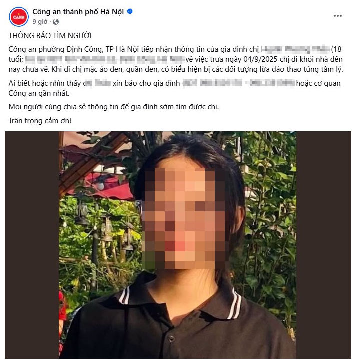 Trước đó, khoảng 12h39 ngày 4/9, cháu H.P.T (18 tuổi, trú tại KĐT Kim Văn - Kim Lũ) rời khỏi nhà và mất liên lạc với gia đình. Theo gia đình, khi rời nhà T. mặc áo đen, quần đen và có biểu hiện bị các đối tượng lừa đảo thao túng tâm lý.