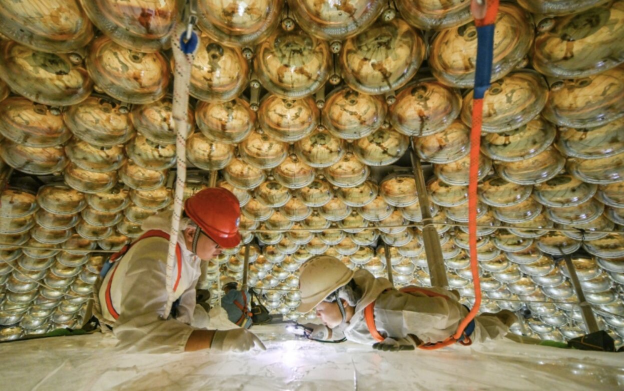 Ở độ sâu 700 mét dưới lòng đất, sâu trong một ngọn núi yên tĩnh ở Giang Môn, Quảng Đông, một quả cầu thủy tinh có đường kính hơn 35 mét đang lặng lẽ thu thập các "hạt ma" từ vũ trụ - neutrino.
