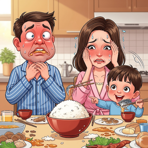 Cả bàn ăn im lặng. Anh chồng nghẹn miếng, chị vợ đỏ mặt. Còn đứa con thì vẫn hồn nhiên... gắp cá.