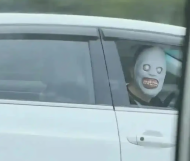 Sự việc xảy ra vào ngày 24/8. Theo đoạn video được hành khách trên một chiếc xe chạy cùng chiều ghi lại, người đàn ông ngồi trong xe phía trước bất ngờ hạ cửa kính, quay sang nhìn sang chiếc xe bên cạnh với chiếc mặt nạ đáng sợ che kín gương mặt.