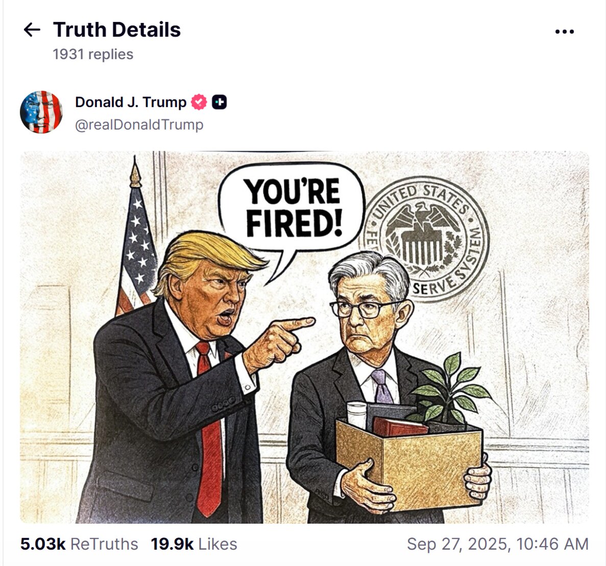 Bài đăng trên Truth Social là hình ảnh ông chỉ tay và hét lớn "ÔNG BỊ SA THẢI!" vào Powell, người đang cầm một chiếc hộp đựng đồ đạc của mình. Phía sau là hình ảnh con dấu của Cục Dự trữ Liên bang.