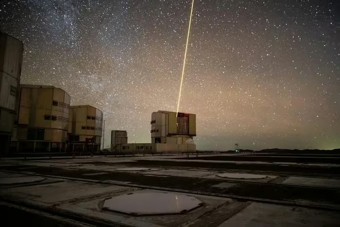 Một kính viễn vọng chiếu tia laser lên bầu trời tại đài quan sát Paranal, khu vực sa mạc Atacama ở Chile. Ảnh: THE NEW YORK TIMES