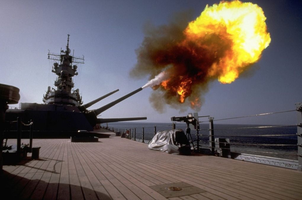Thiết giáp hạm USS Wisconsin khai hỏa một trong các khẩu pháo Mark 7 hồi năm 1991 (Ảnh: BI).