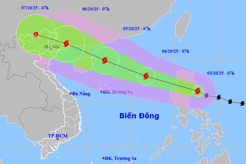 Đến 7h sáng mai (4/10), tâm bão trên vùng biển phía Bắc khu vực Bắc Biển Đông, cách bán đảo Lôi Châu (Trung Quốc) khoảng 750 km về phía Đông Đam với cường độ cấp 10-11, khi giật lên cấp 14.