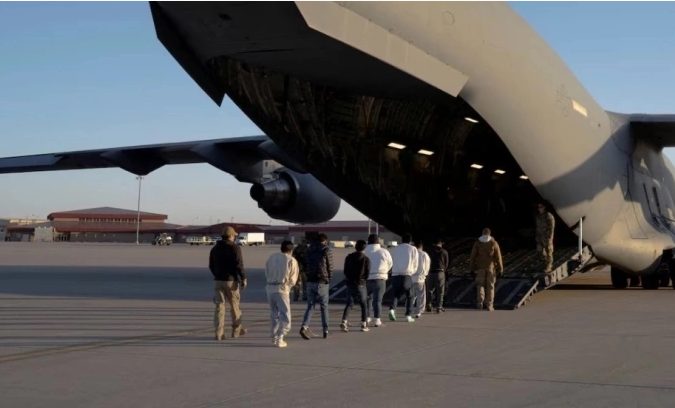 Người nhập cư bất hợp pháp lên chuyến bay trục xuất ở Fort Bliss, Texas, ngày 23/1. Ảnh: Reuters